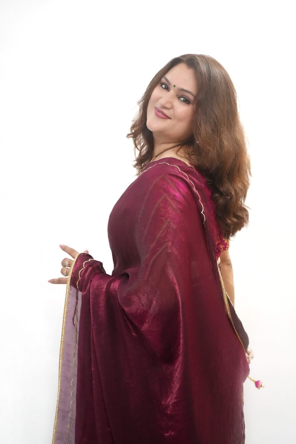 Pink Tissue Saree With an elegant border to enhance its look and feel. It comes with a stitched blouse. Suitable for wedding ceremonies and puja rituals.