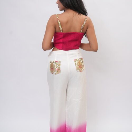 White and pink woven corset has a round neck, sleeveless, and a smoking back adjustable up to 2 size up for comfort and flexible fit. comes with a same fabric loose fit bottom has an partially elasticated waistband with slip-on closure.