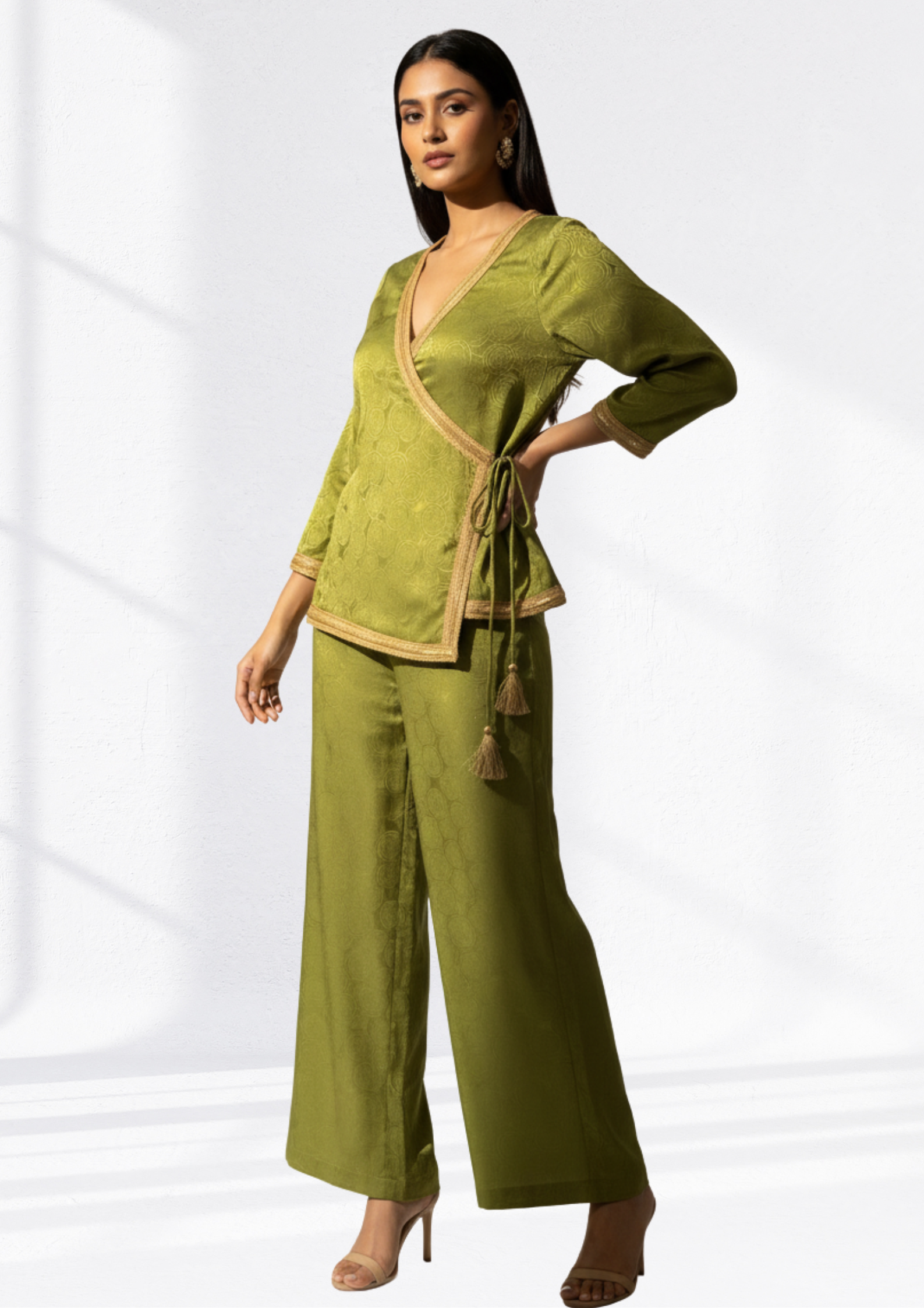 Gree co-ord set has a round neck, sleeveless, and a smoking back adjustable up to 2 size up for comfort and flexible fit. comes with a same fabric loose fit bottom has an partially elasticated waistband with slip-on closure.