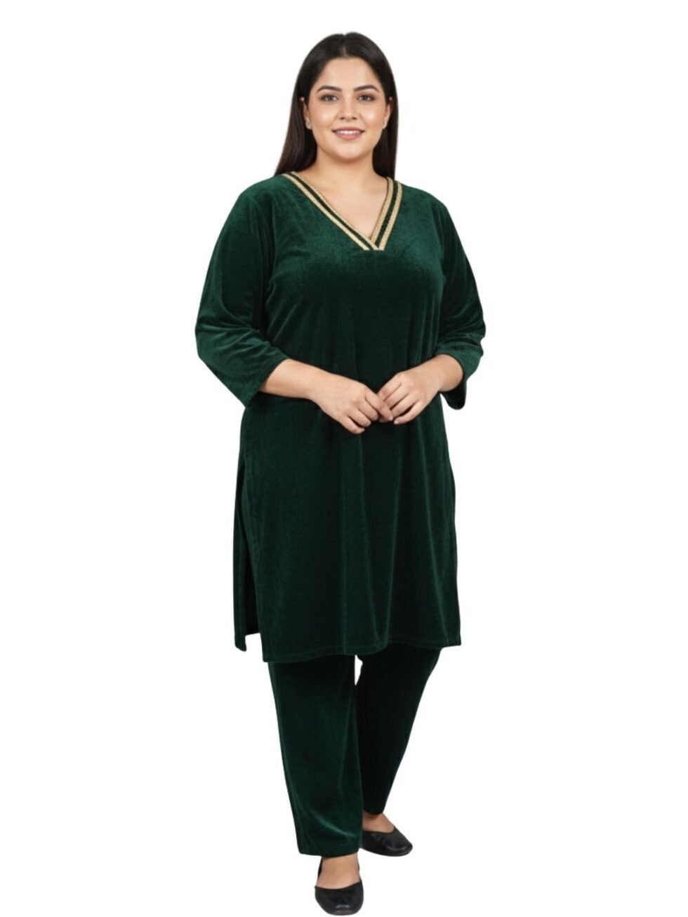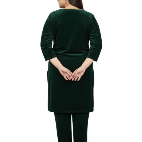 Straight cut, knee-length green velvet kurti embellished with golden lace along the neck-line to enhance the look.