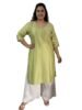Straight cut, knee-length Olive Green kurti embellished with golden lace along the neck-line and sleeves to enhance the look.